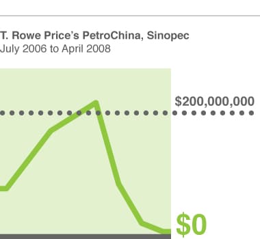T. Rowe Price was the first major mutual fund company to divest its holdings in foreign oil companies which help to fund the government of Sudan’s deadly campaign of violence against millions of its citizens. By January 2008, T. Rowe Price had sold 93% of their holdings in Petrochina and Sinopec. By April 2008, T. Rowe Price had sold all those holdings. In July 2007, prior to their sell-off, T. Rowe Price held about equal amounts of PetroChina and Sinopec (China Petroleum) totaling over $200 million.